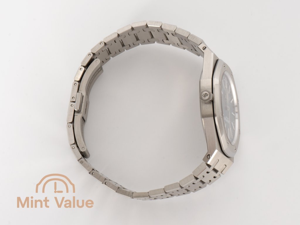 | Dial details: | Bleu nuit nuage 50 dial with Petite Tapisserie pattern, white gold applied hour-markers and Royal Oak hands with luminescent coa |
