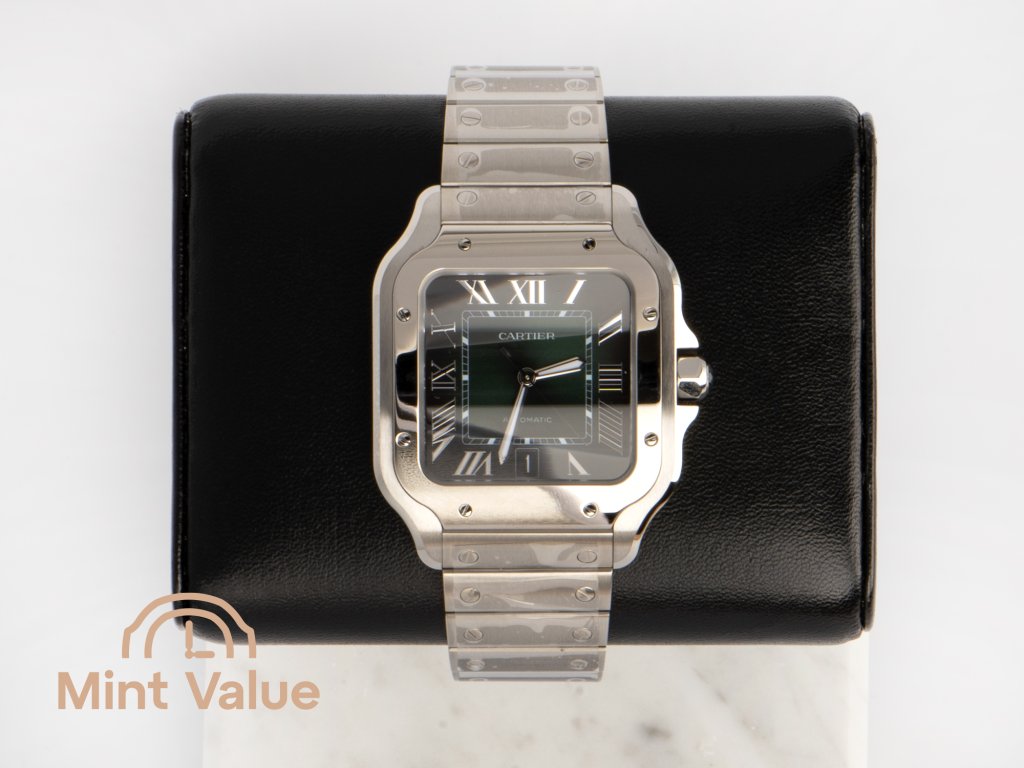 The green sunray-finish dial shifts from deep forest to emerald tones as light moves across it — a rare and captivating expression of modern Cartier aesthetics. Its contrast with the silver Roman numerals and steel case enhances both legibility and allure.