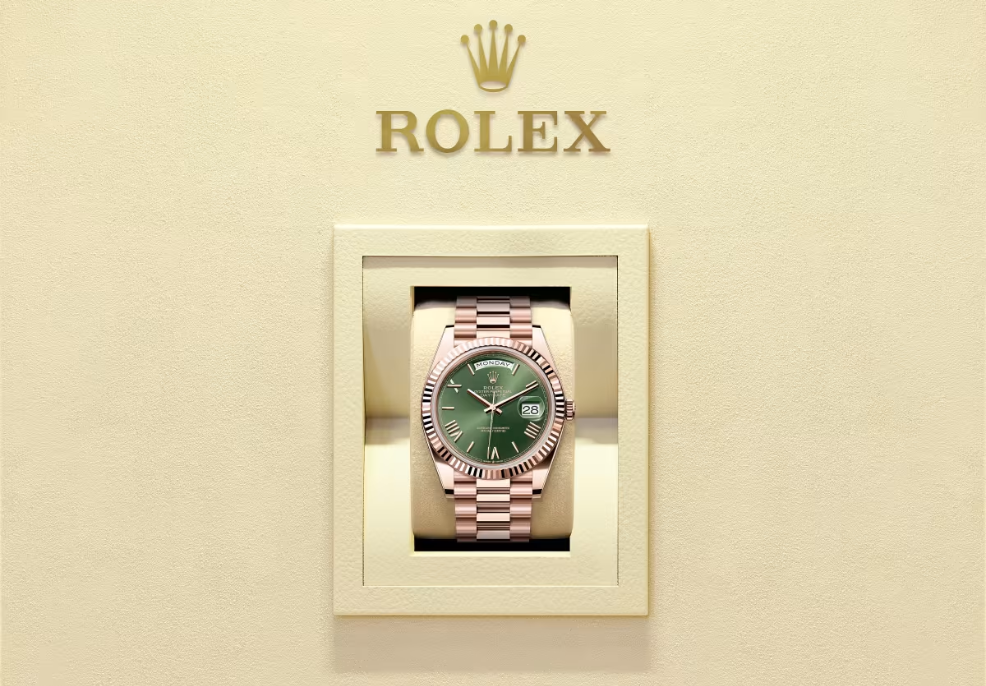 Harmonie síly a elegance. Hodinky Rolex Day-Date 40 Ref. 228235 z 18karátového zlata Everose dosahují vzácné rovnováhy mezi teplem a intenzitou. Jeho zelený ciferník se slunečním vzorem – jedna z nejžádanějších konfigurací v kolekci – vytváří živý, ale rafinovaný kontrast s růžovými tóny pouzdra a náramku. Tato kombinace se stala moderním symbolem úspěchu, obdivovaným pro svou tichou sebejistotu a nezaměnitelnou přítomnost.