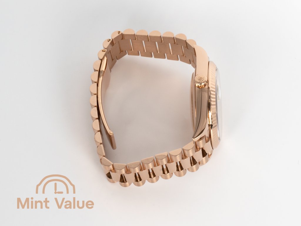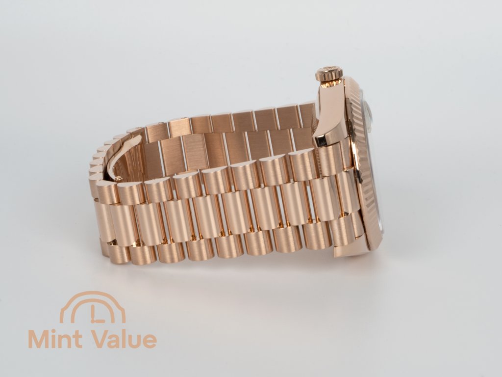 Harmonie síly a elegance. Hodinky Rolex Day-Date 40 Ref. 228235 z 18karátového zlata Everose dosahují vzácné rovnováhy mezi teplem a intenzitou. Jeho zelený ciferník se slunečním vzorem – jedna z nejžádanějších konfigurací v kolekci – vytváří živý, ale rafinovaný kontrast s růžovými tóny pouzdra a náramku. Tato kombinace se stala moderním symbolem úspěchu, obdivovaným pro svou tichou sebejistotu a nezaměnitelnou přítomnost.