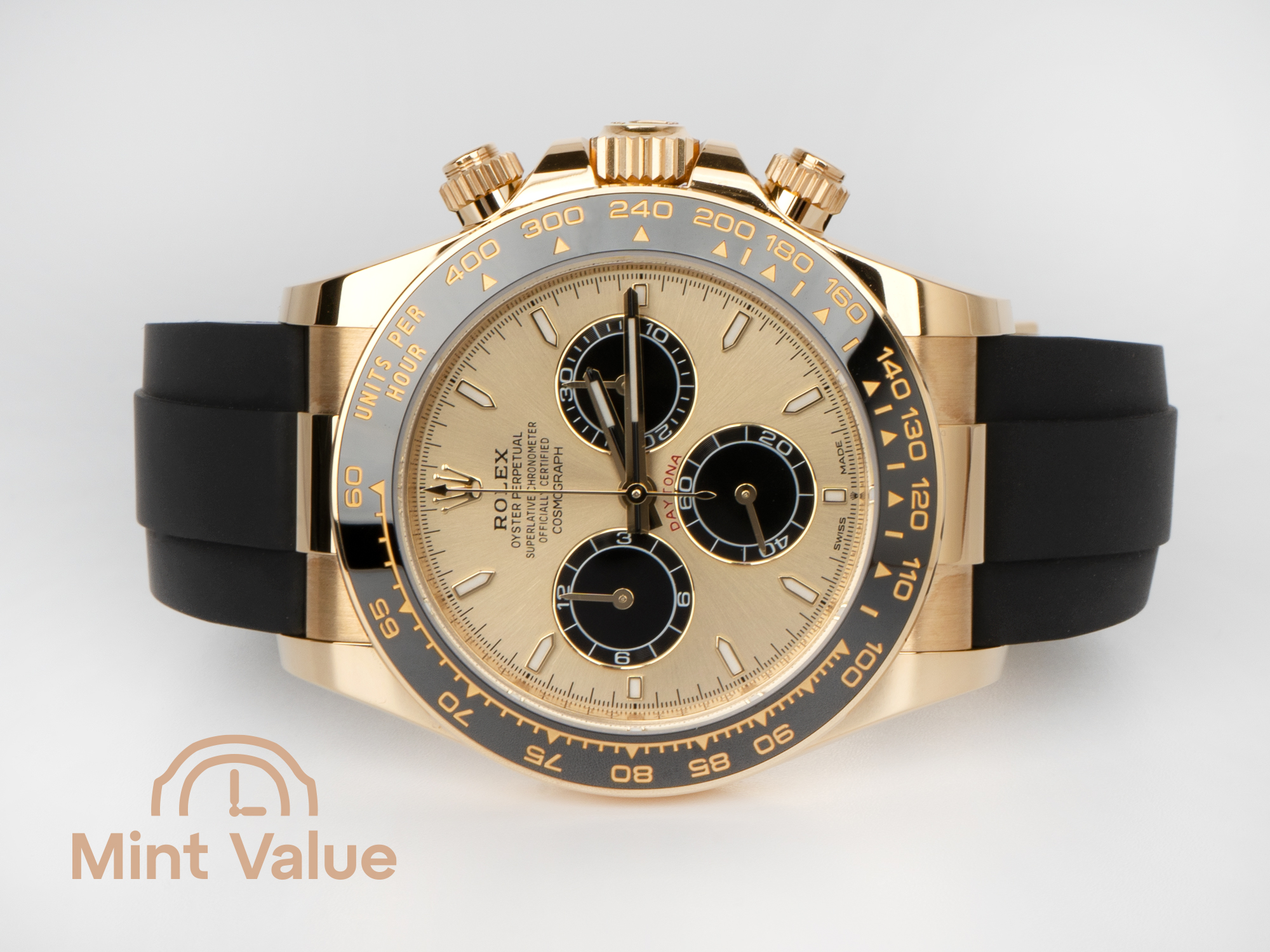 Černý ciferník je doplněn zlatými akcenty a kontrastními subciferníky, které podtrhují jeho sportovní charakter a zároveň zachovávají každodenní čitelnost. Černá luneta Cerachrom je opatřena tachymetrickou stupnicí – charakteristickým rysem modelu Daytona, který umožňuje měřit průměrnou rychlost až 400 jednotek za hodinu.