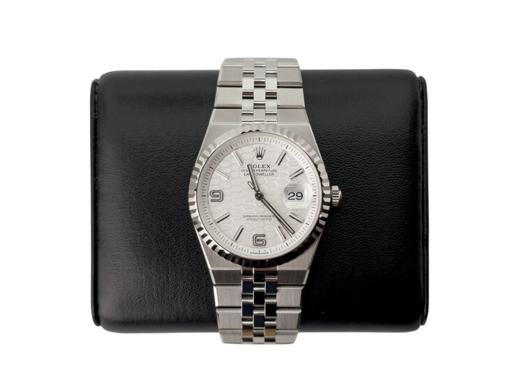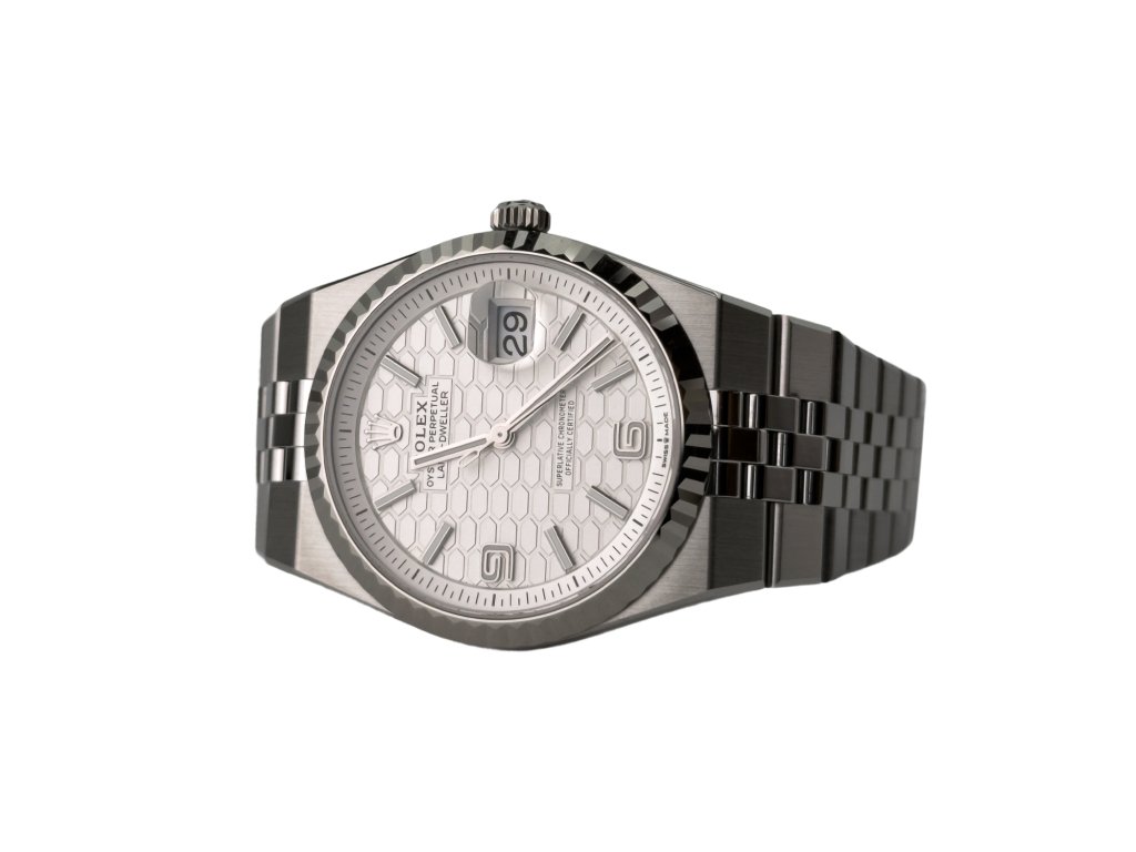 Bílý ciferník s motivem „voštiny” přináší texturu a nuance, které se v klasické řadě Rolex vyskytují jen zřídka. Každá šestiúhelníková buňka odráží světlo jinak, což hodinkám dodává jemnou, dynamickou hru tónů po celé ploše – elegantní, hmatatelnou a tiše jedinečnou.