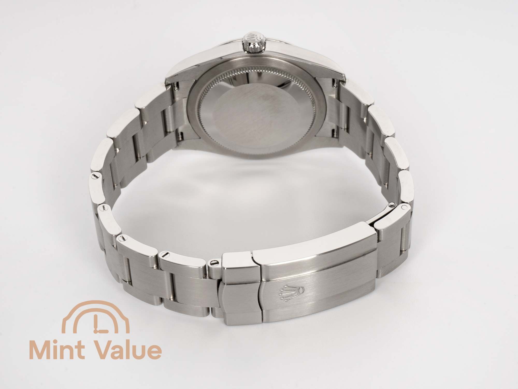 Pouzdro o průměru 34 mm, vyrobené výhradně z oceli Oystersteel, nabízí odolnost, odolnost proti korozi a vyváženou přítomnost na zápěstí, která se hodí jak pro každodenní nošení, tak pro slavnostnější příležitosti. Tato konfigurace vyniká svou charakteristickou barvou, přičemž si zachovává nezaměnitelný styl a kvalitu Rolex.