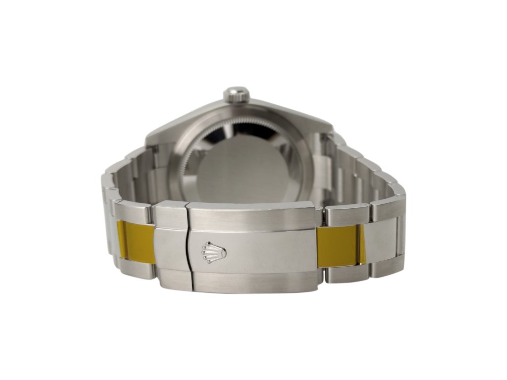 Pouzdro Oystersteel o průměru 42 mm a masivní náramek Oyster dodávají hodinkám robustní, ale vyvážený vzhled, který doplňuje modrý ciferník se světelnými indexovými značkami.