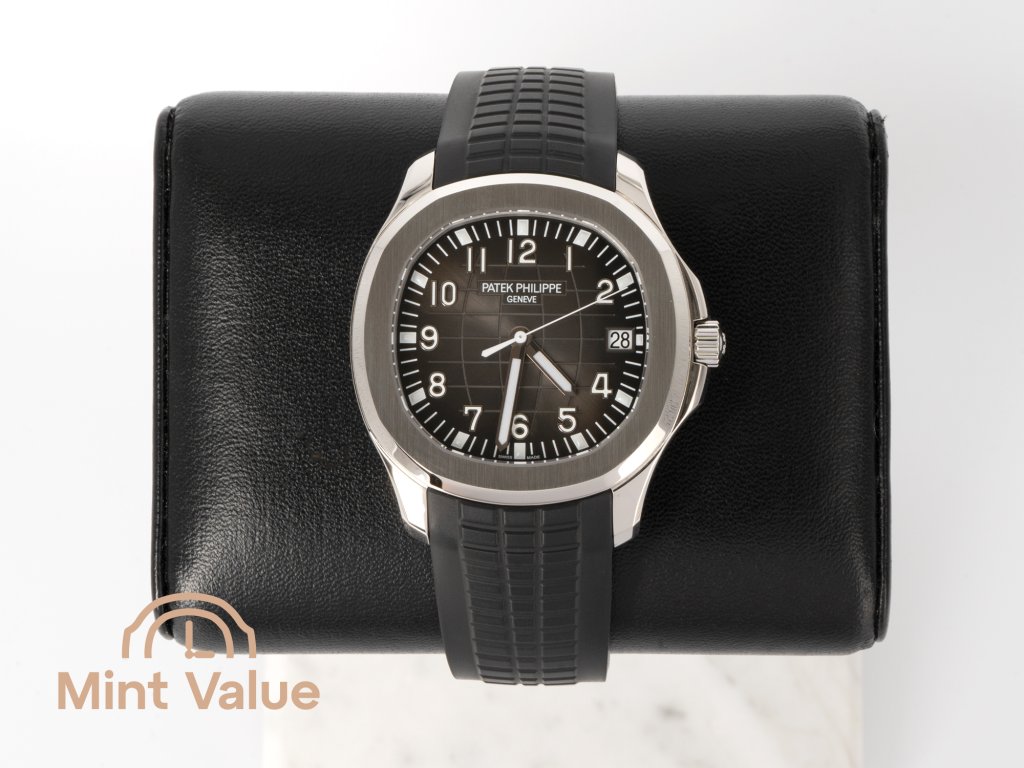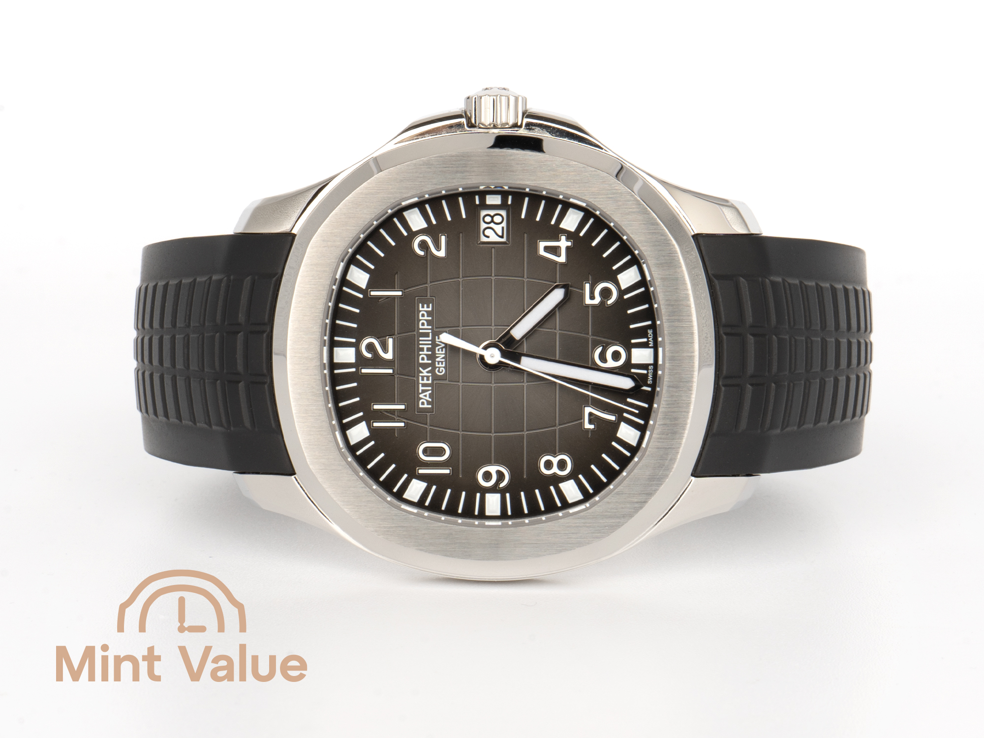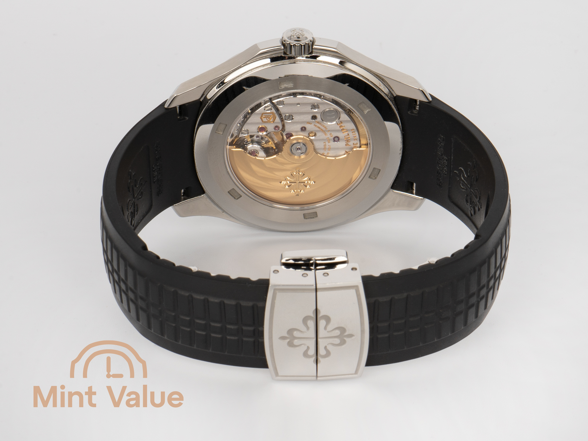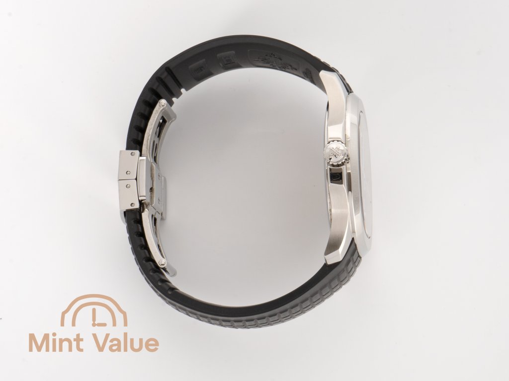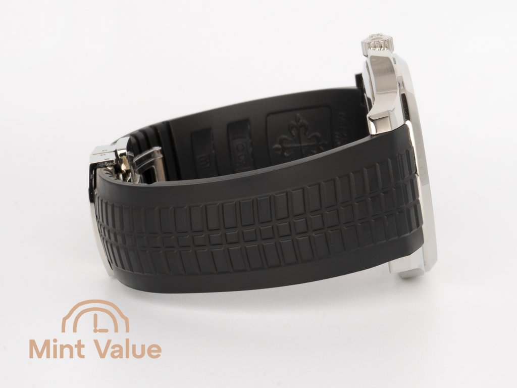 | Dial details: | Sunburst charcoal gray with black-gradient rim, embossed Aquanaut pattern, white gold applied numerals with white luminescent co |