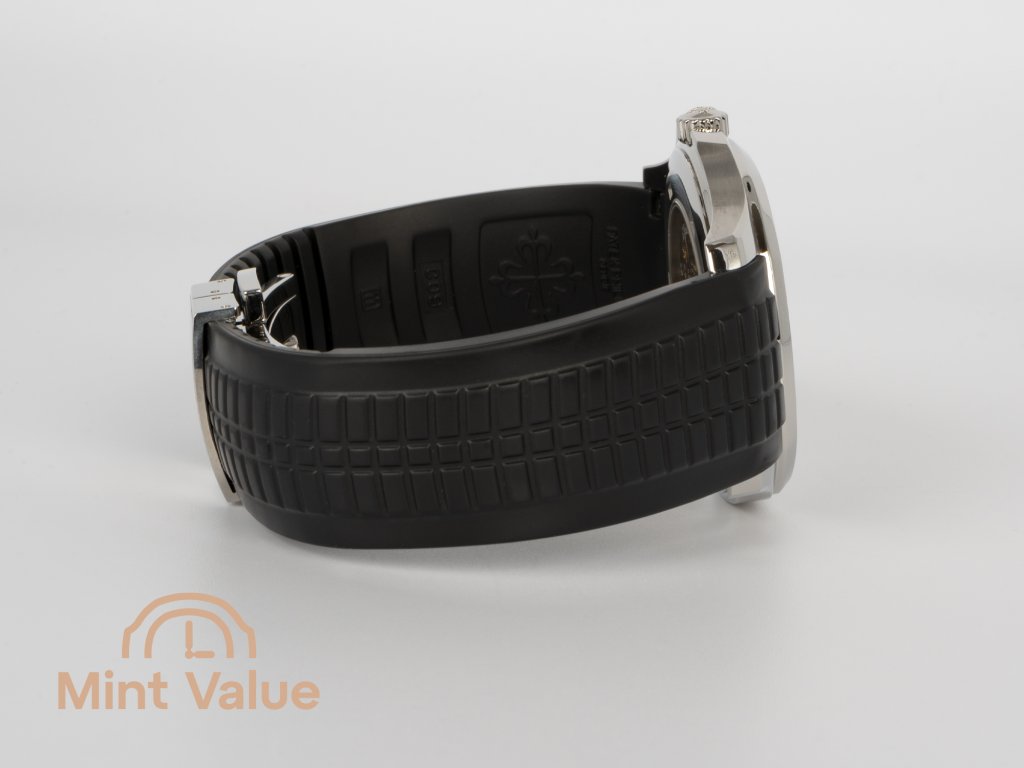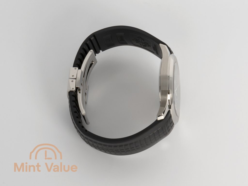 The black “Tropical” strap — made from a high-tech composite resistant to UV rays, salt water, and wear — embodies the Aquanaut’s philosophy of elegant practicality. Its texture echoes the dial’s embossed motif, creating perfect visual harmony.
