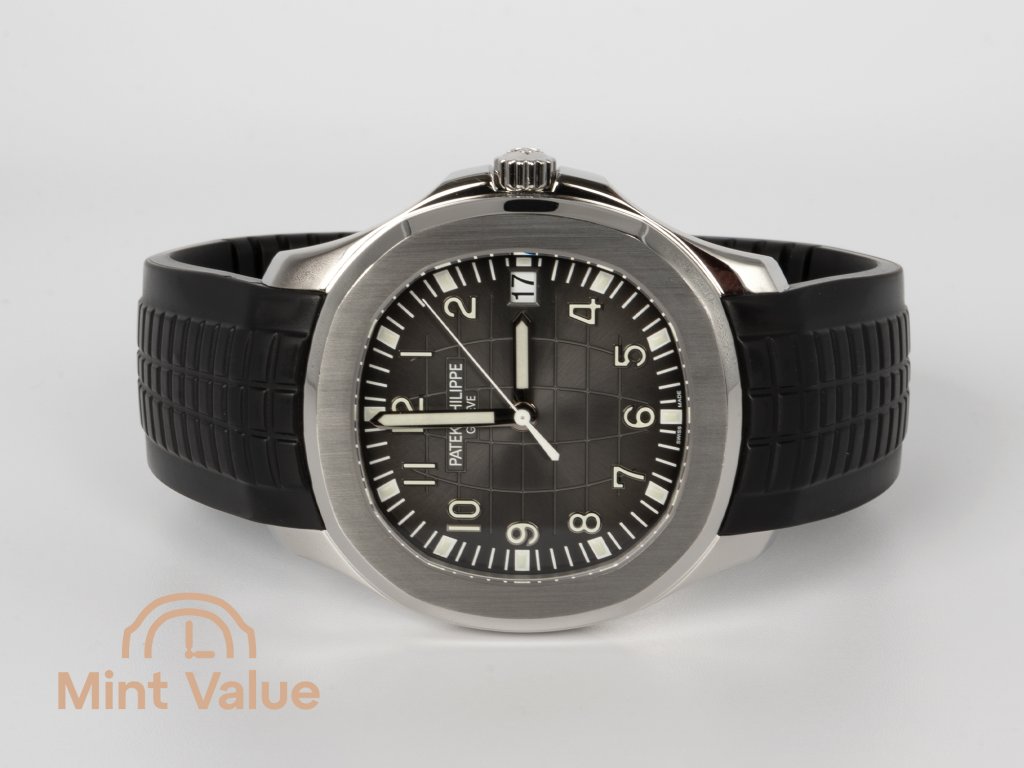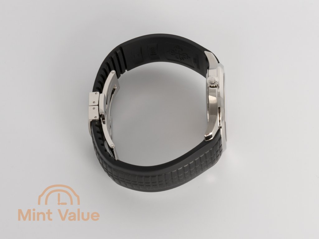 | Dial details: | Sunburst charcoal gray with black-gradient rim, embossed Aquanaut pattern, white gold applied numerals with white luminescent co |