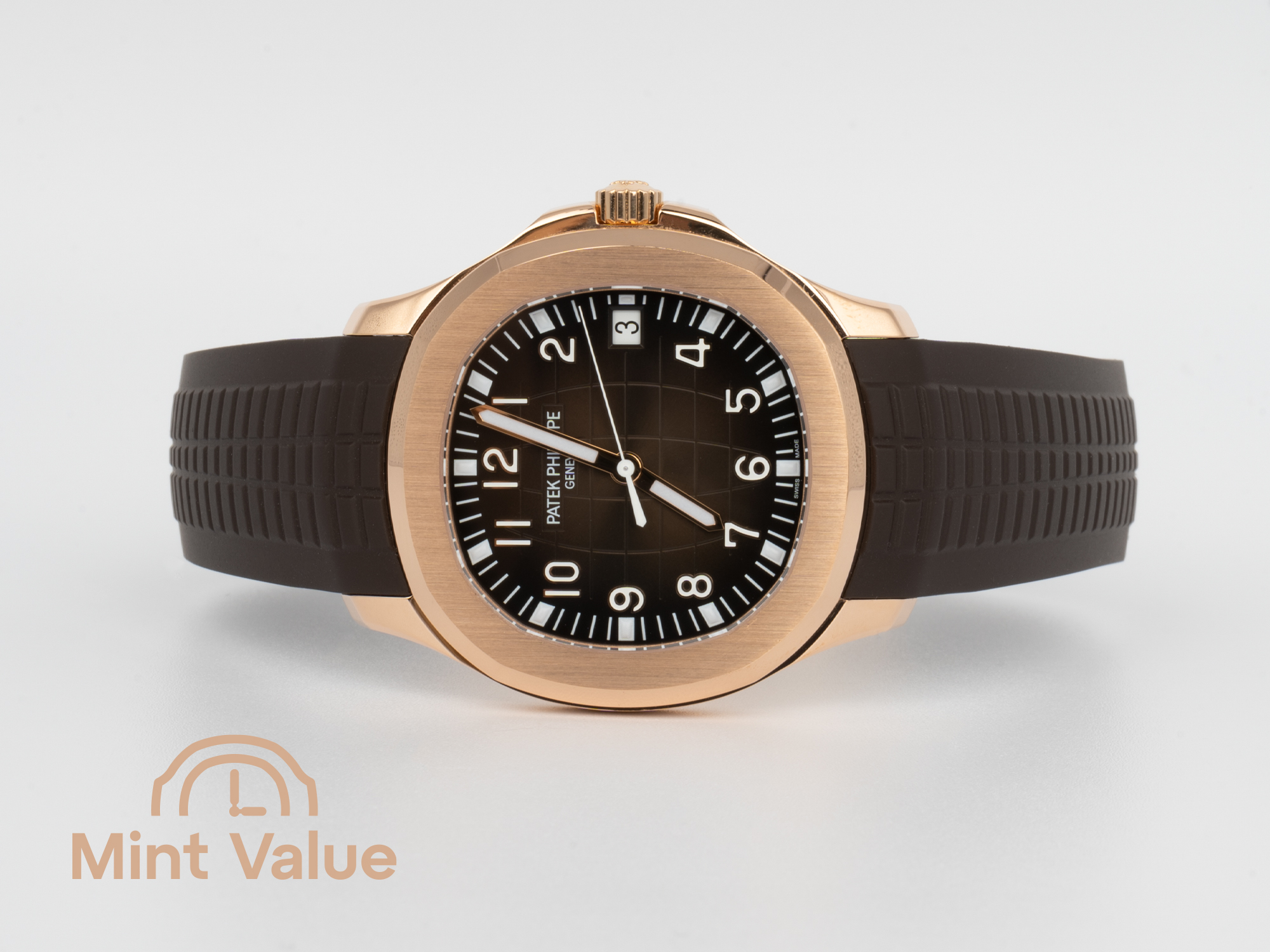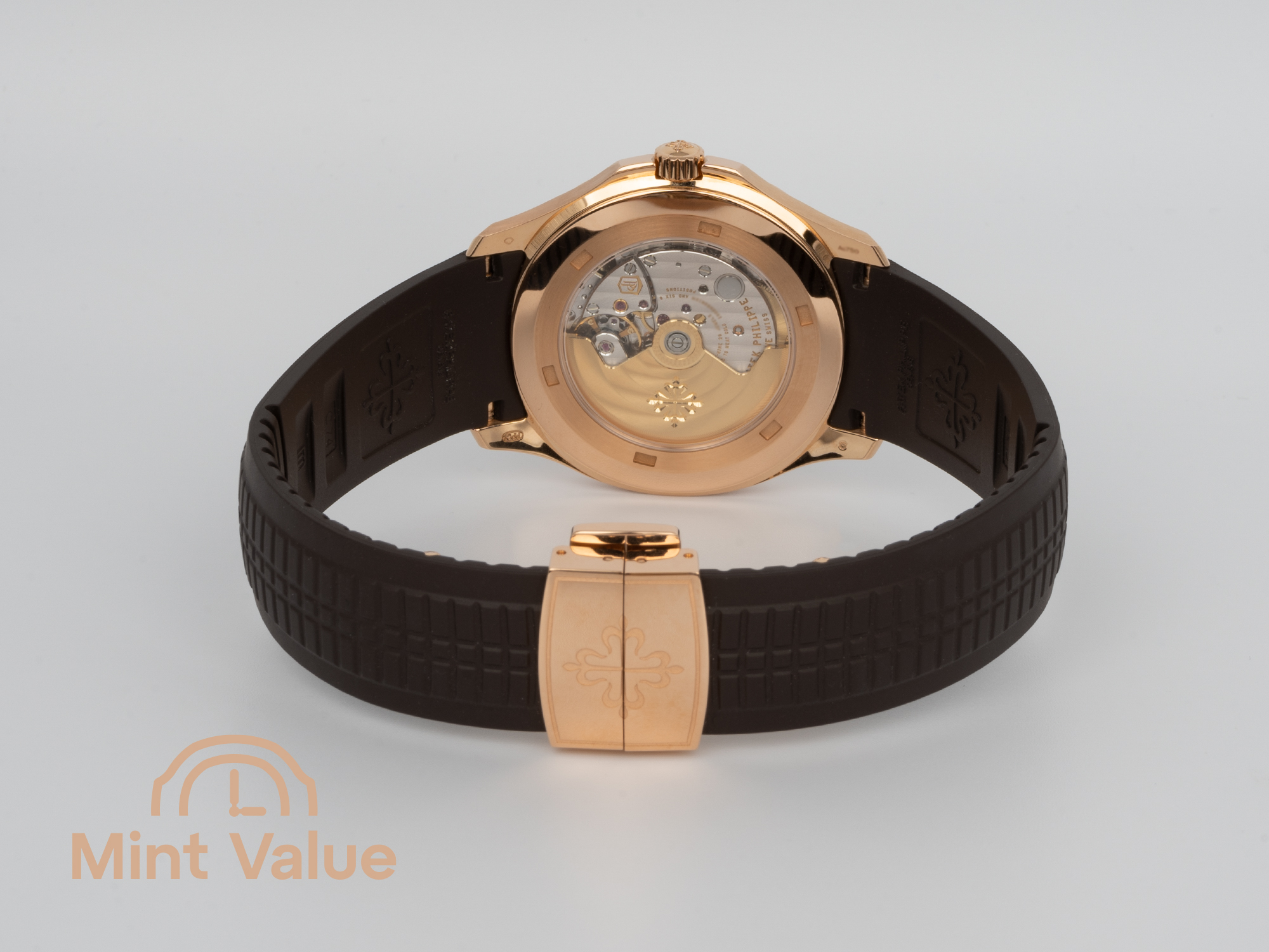 | Dial details: | Sunburst brown with black-gradient rim, embossed Aquanaut pattern, rose gold applied numerals with white luminescent coating. Ro |