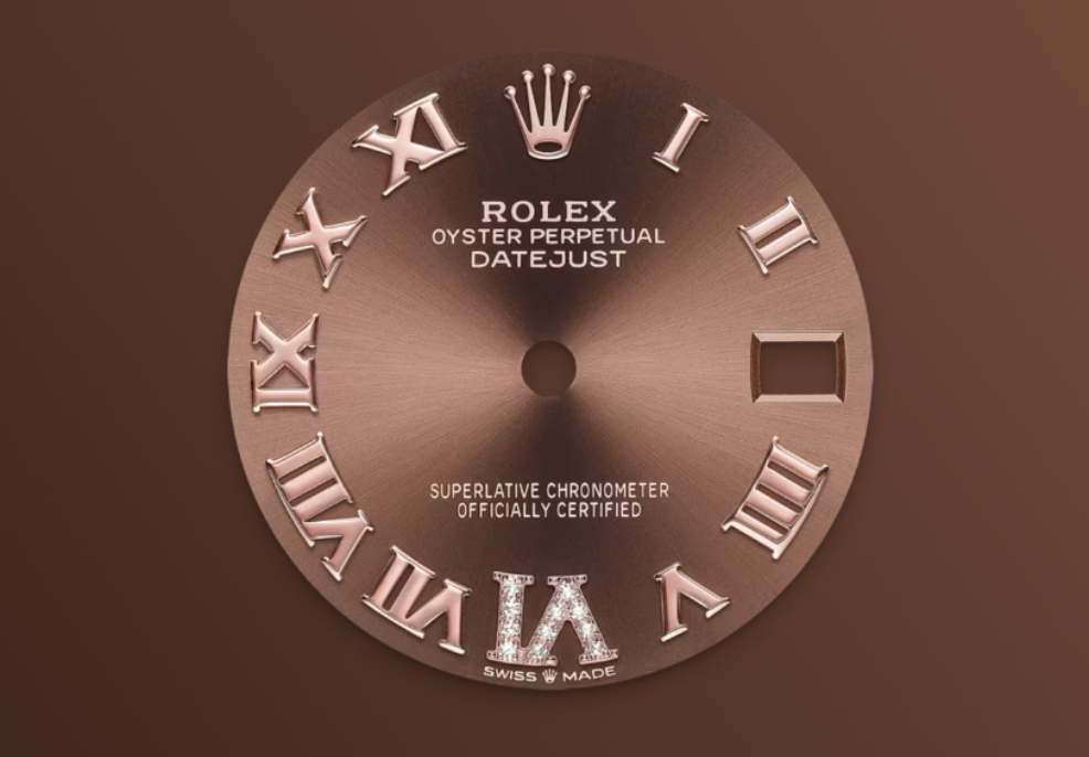 The large VI, set with 11 brilliant-cut diamonds, adds a singular touch of sparkle that distinguishes this configuration within the Datejust line. The warm chocolate dial — a signature hue in Rolex’s palette — enhances the model’s luxurious yet modern appeal.