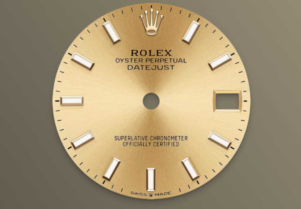 The combination of steel and yellow gold has been a cornerstone of the Datejust identity since the 1940s. The fluted bezel in solid 18 ct gold, paired with the Jubilee bracelet, creates an instantly recognizable silhouette that epitomizes Rolex heritage.