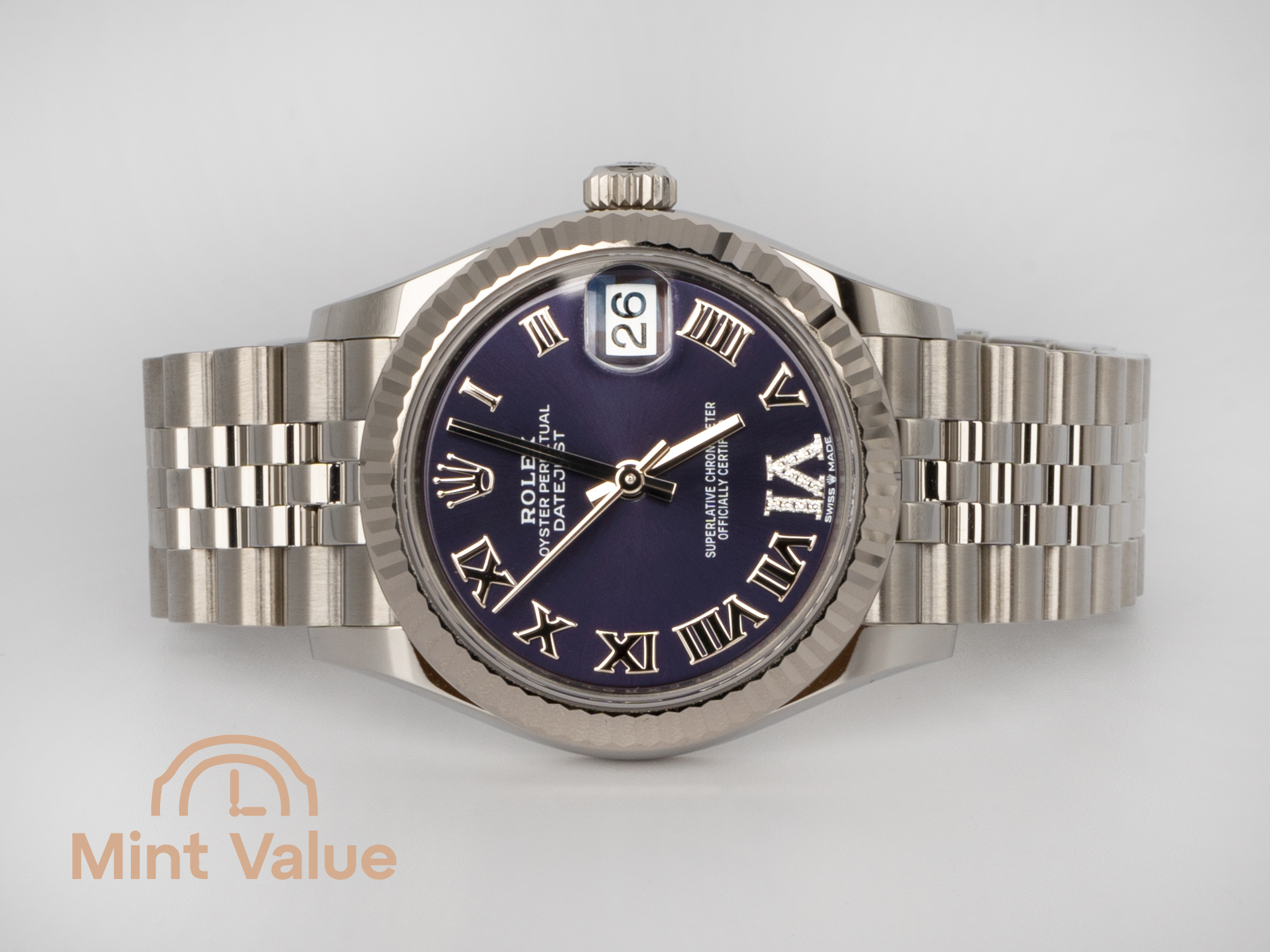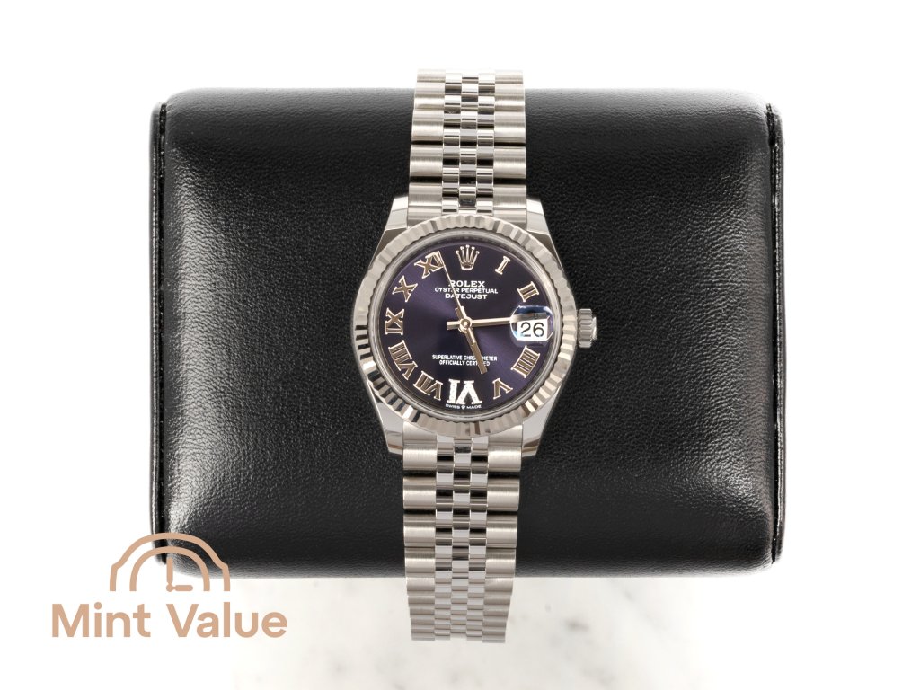 Distinctive dial colors paired with restrained diamond detailing are produced in limited numbers and remain highly attractive to discerning buyers. The “Aubergine VI” configuration offers a balance of individuality and classic Rolex design, positioning it as a refined alternative to more conventional Datejust models. Its unique dial execution supports stable demand and long-term desirability on the secondary market.