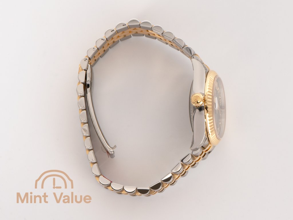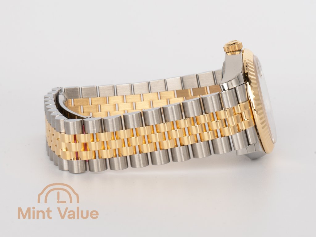 The 31 mm Oyster case is waterproof to 100 meters and topped with the fluted bezel in 18-carat yellow gold — a Rolex hallmark that combines aesthetic refinement with functional heritage. The Jubilee bracelet, with its five-piece links and concealed Crownclasp, ensures exceptional comfort and a seamless, elegant profile on the wrist.