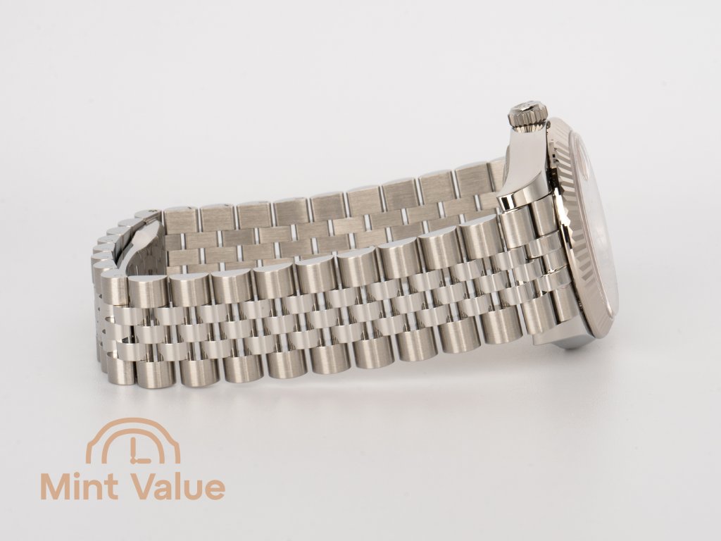 The 31 mm Oyster case is waterproof to 100 m and fitted with the signature fluted bezel in 18-carat white gold — both a visual hallmark and a functional element. The Jubilee bracelet, with its five-piece links and concealed Crownclasp, provides outstanding comfort and a refined, jewelry-like presence on the wrist.