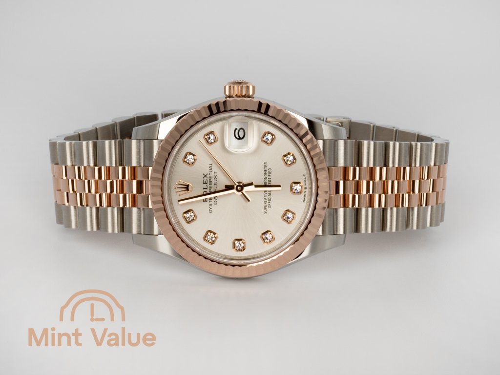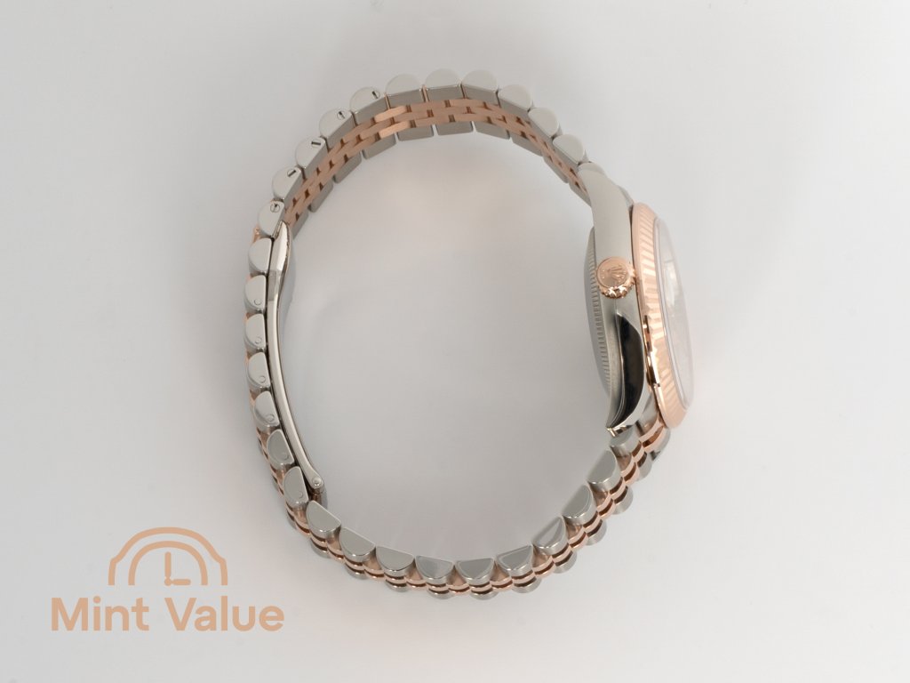 Crafted in Everose Rolesor — a combination of Oystersteel and 18 kt Everose gold — the watch offers warmth and unmistakable Rolex identity. The 31 mm case size delivers elegant presence while remaining versatile for everyday wear.