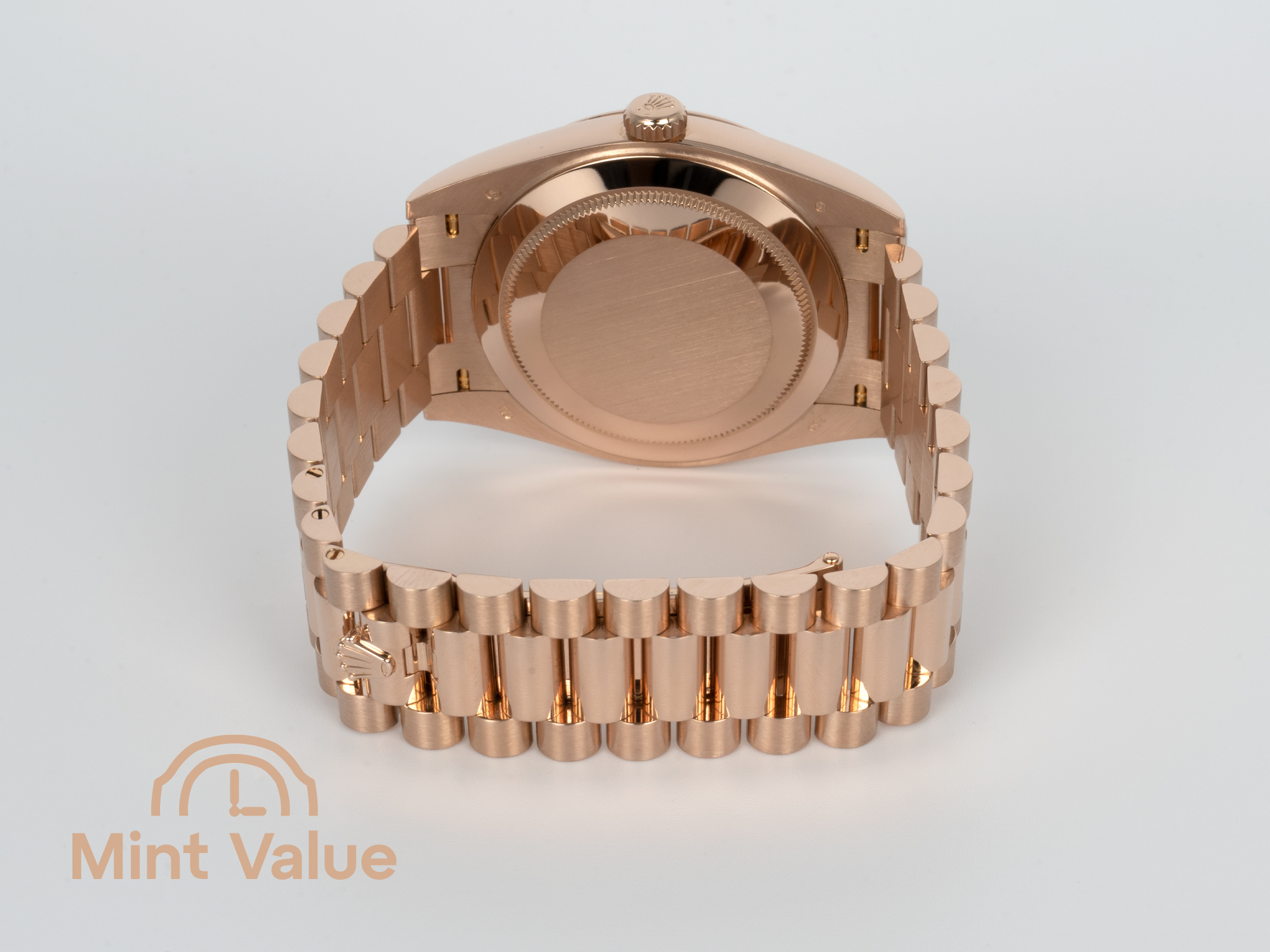 The green dial has become one of the most recognizable and sought-after colorways in the Day-Date lineage. Its radiant hue captures light differently from every angle, highlighting the meticulous sunray finish and the natural warmth of Everose gold.