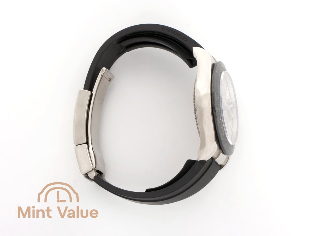 White gold brings an understated glow rather than overt shine, while the black Cerachrom bezel anchors the design with depth and precision. The Oysterflex strap adds comfort without compromising the watch’s sophistication.