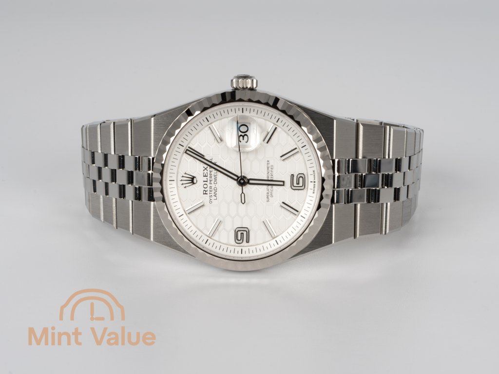 The white “honeycomb” motif dial introduces texture and nuance rarely seen in Rolex’s classic line-up. Each hexagonal cell reflects light differently, giving the watch a soft, dynamic play of tone across its surface — elegant, tactile, and quietly unique.