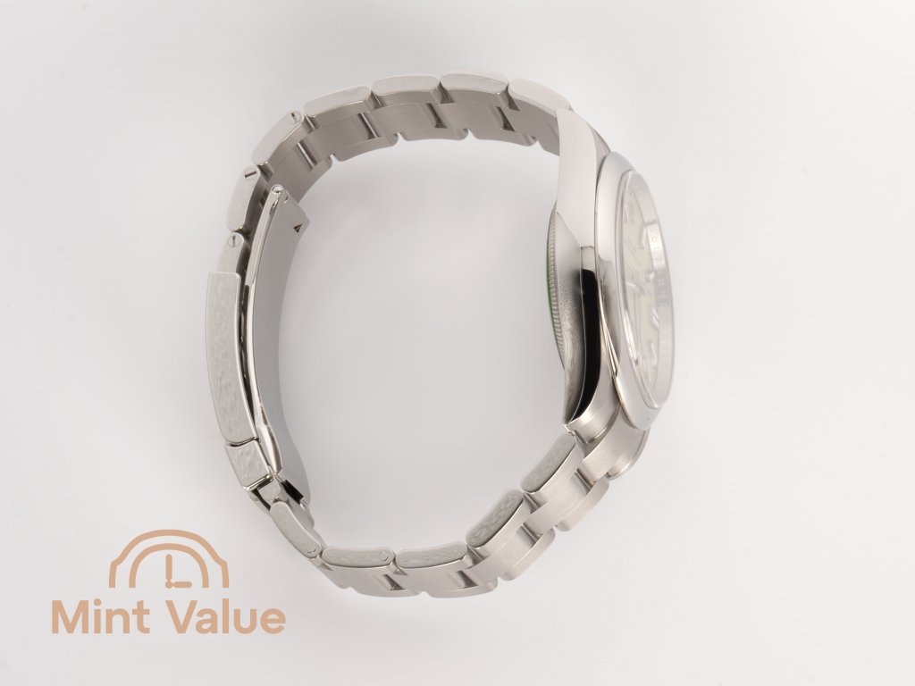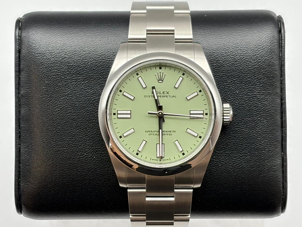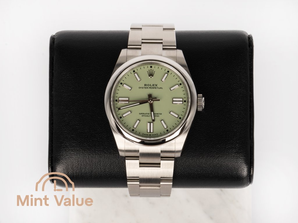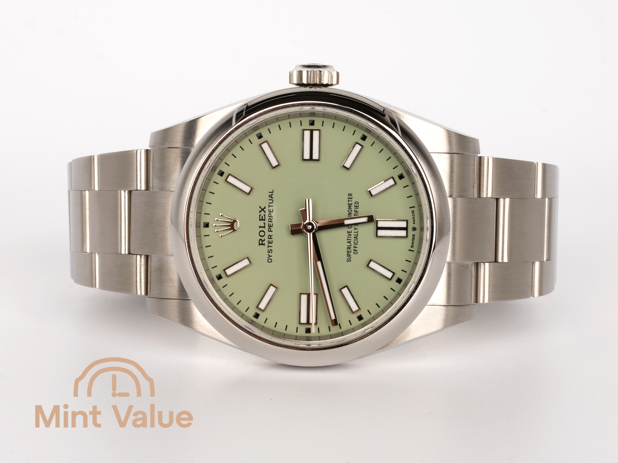 Colored Oyster Perpetual dials have become highly desirable among collectors, particularly the softer, less saturated tones. The Pistachio dial stands out for its rarity and distinctive aesthetic, positioning this reference as both a wearable statement and a long-term value piece.